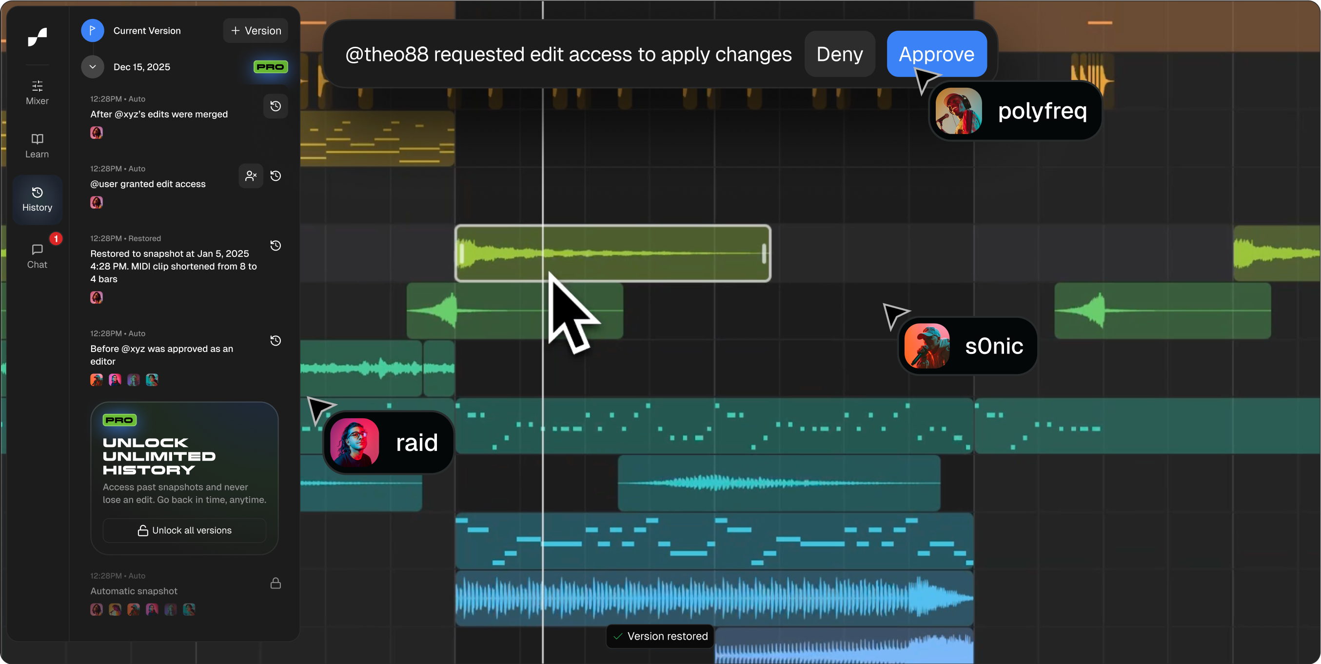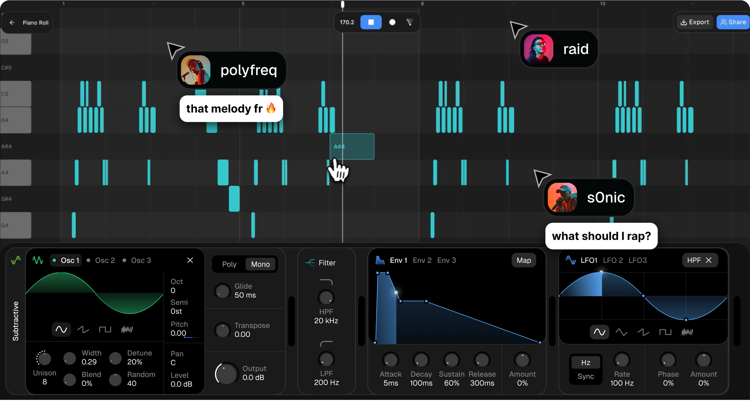 Edit notes, chords, and melodies together in real time — see every collaborator's cursor as they compose.